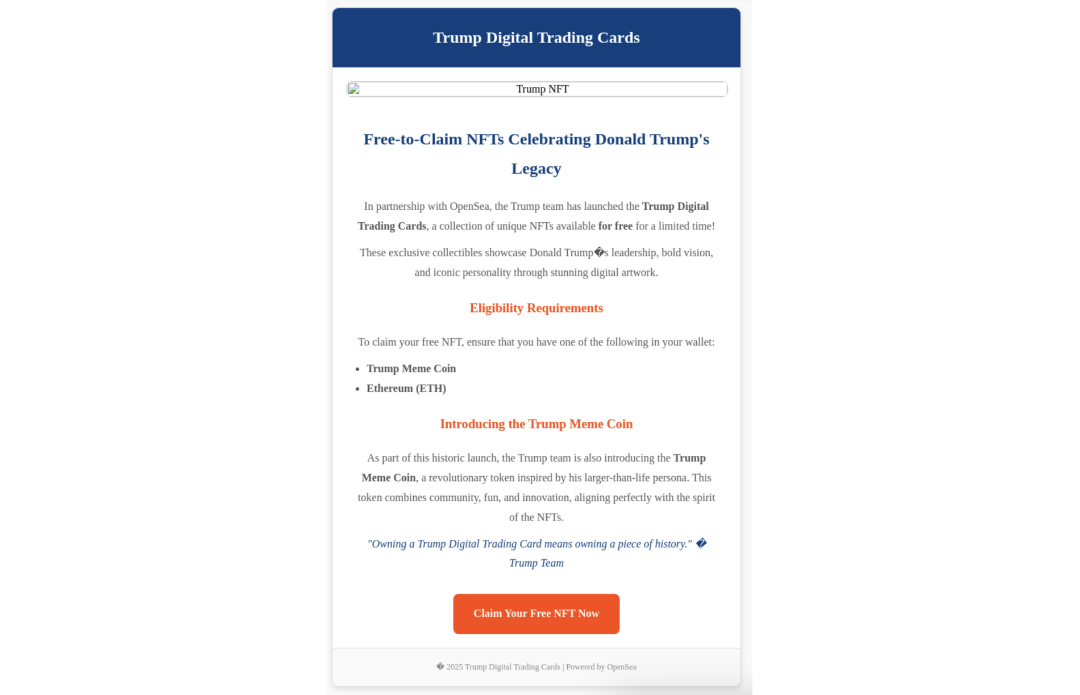 川普總統最近就職,加上他對加密貨幣的支持以及以他的名字命名的加密貨幣的推出,引發了一波利用唐納德·川普名字的網路釣魚詐騙浪潮。一些偽造的 NFT「數位交易卡」(如下圖所示)以及其他與加密貨幣相關的產品,紛紛湧現,吸引著那些被獨家 NFT 和所謂官方合作關係的誘惑所吸引的愛好者。