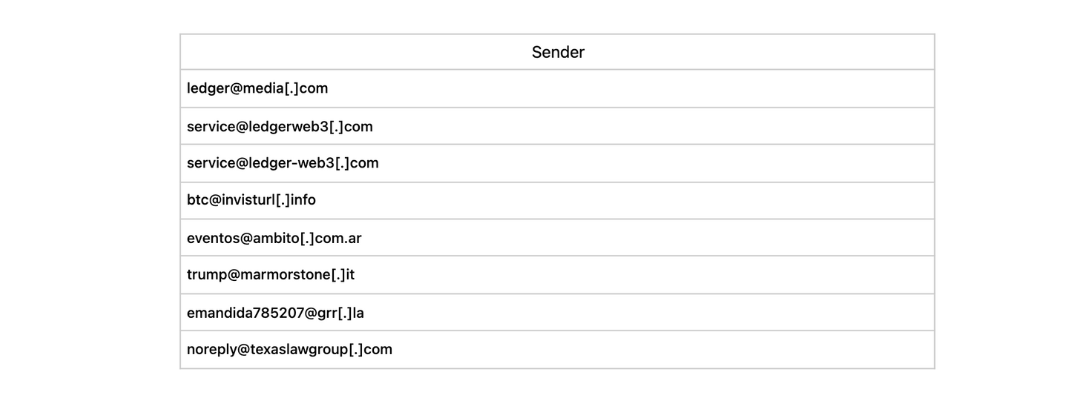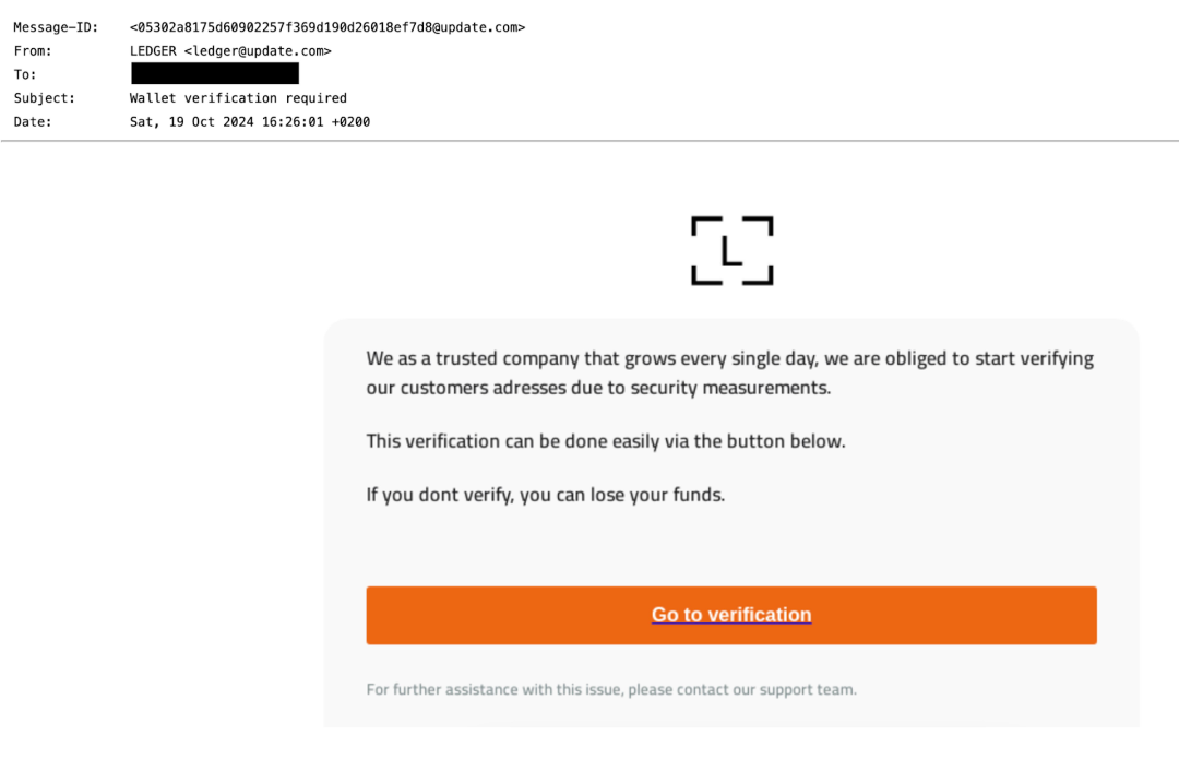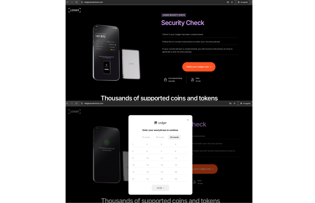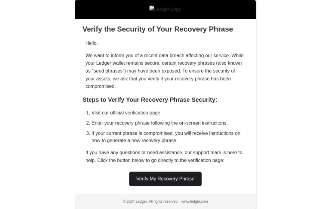在近期觀察到的另一起冒充活動中,攻擊者創建了一個冒充知名加密貨幣錢包 Ledger 的網站。隨後,他們發送釣魚郵件,其中包含與 Ledger 品牌高度相似的標誌、字體和設計元素(如下圖所示)。該郵件偽裝成安全通知,引導使用者點擊「驗證我的恢復短語」按鈕。該連結會將用戶引導至 ledgerprotecthub[.]com,這是一個最近創建的虛假網站,旨在竊取帳戶憑證和資金。用戶以「驗證」或解決虛假安全問題的名義輸入助記詞,卻在不知情的情況下將錢包的完全訪問權限授予了攻擊者。