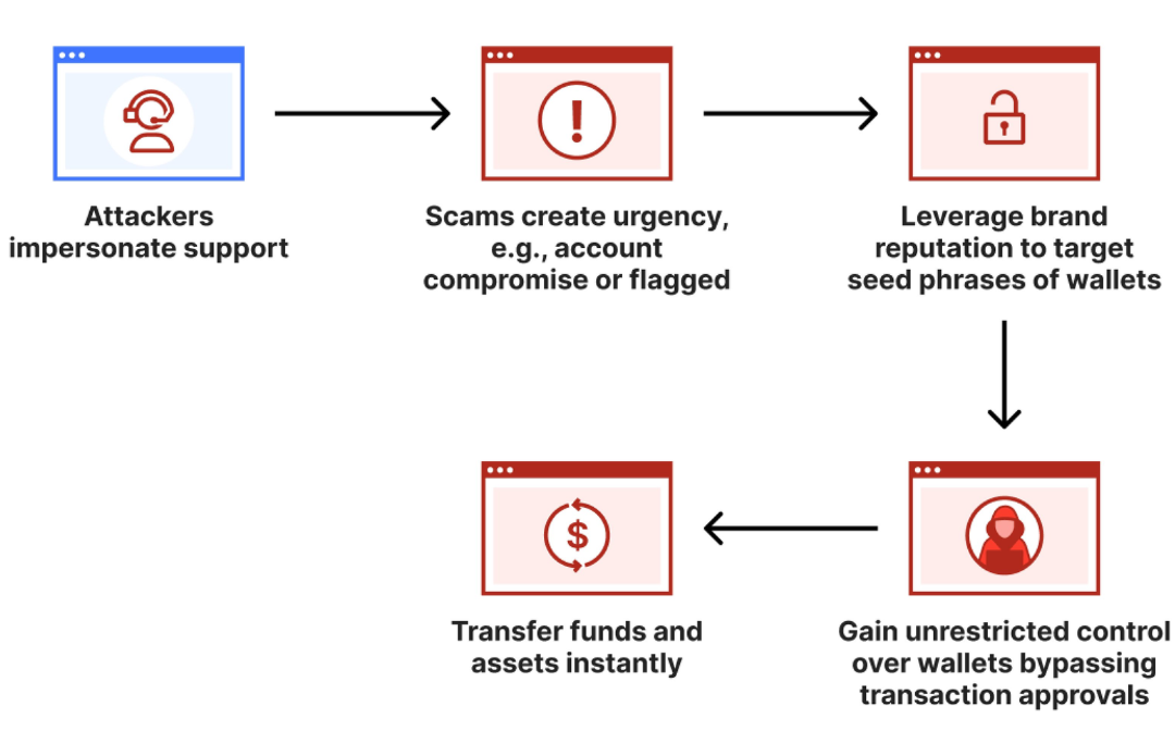 攻擊者經常冒充客服人員或知名公司代表,誘騙用戶交出敏感憑證或轉移資金。這些騙局通常會製造緊急狀況,聲稱有帳戶洩露或交易被標記等問題。攻擊者利用大品牌的聲譽獲取錢包的助記詞,繞過交易審批,獲得對錢包的無限制控制權。這使得他們能夠比「冷儲存」更快地轉移資金和資產。