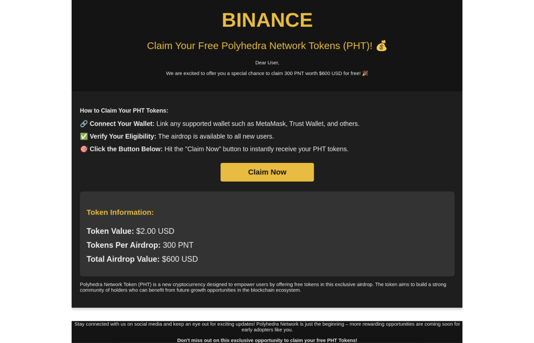 合法的空投通常用於區塊鏈專案分發免費代幣,通常用於推廣新代幣或獎勵忠實用戶。欺詐性空投則利用此概念和「免費加密貨幣」的吸引力,誘使用戶執行錢包操作或支付少量費用來獲取代幣。目標用戶可能會注意到錢包中的代幣,並嘗試將其兌換成更理想的代幣,但卻發現兌換失敗。這可能會引導他們進入區塊瀏覽器,在那裡他們會收到一條訊息,指示他們透過第三方網站領取代幣。攻擊者的最終目標是獲取錢包存取權限或直接竊取資金。