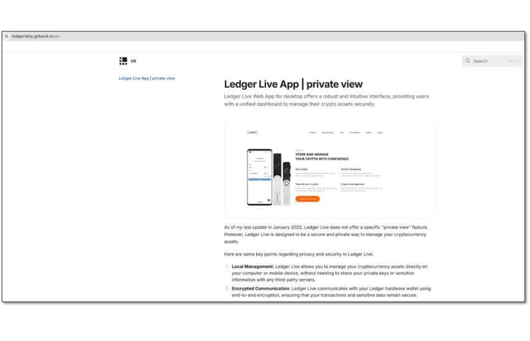 以下是透過電子郵件推廣假冒 Ledger 應用程式的攻擊活動範例,該活動引導用戶訪問 ledgerlielp.gitbook[.]io。該詐騙網站模仿 Ledger 的品牌,承諾提供正品應用中不存在的新功能,誘騙目標用戶洩露個人資訊。