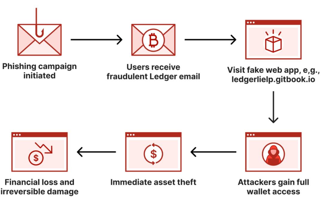 犯罪分子開發與合法加密錢包和交易平台非常相似的欺詐性應用程序,並將其發佈在非官方應用商店或欺騙性網站上,旨在誘騙用戶下載。一旦安裝,這些應用程式就會竊取敏感資訊,例如恢復短語、私鑰和身份訊息,從而導致未經授權的存取和潛在的盜竊。謹慎行事至關重要,正如微軟商店發現的一款假冒 Ledger Live 應用程序,導致總計 76.8 萬美元的損失。