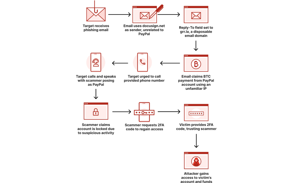 在下面的電話詐騙範例中,目標收到一封電子郵件,提醒他們有一筆 BTC 付款從他們的 PayPal 帳戶使用一個陌生的 IP 位址進行,並敦促他們撥打提供的電話號碼。出於擔憂,目標可能會撥打該號碼,結果卻接到了冒充 PayPal 支援代表的騙子。騙子聲稱:「您的帳戶因可疑活動已被鎖定。請提供您的雙重認證碼以重新獲得訪問權限。」受害者相信來電者的合法性,可能會提供代碼,從而允許攻擊者訪問他們的帳戶和資金。