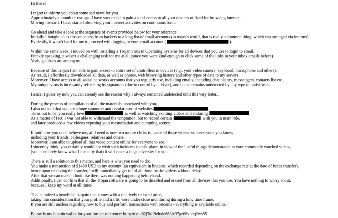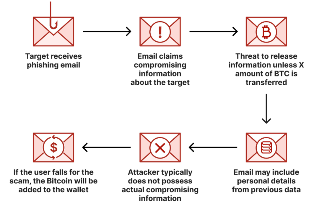 威脅行為者會發送威脅性電子郵件或短信,聲稱可以存取目標的個人資訊。他們脅迫受害者支付加密貨幣贖金,以阻止偽造或被盜資料的外洩。這些騙局也經常利用資料外洩資訊來增強說服力。